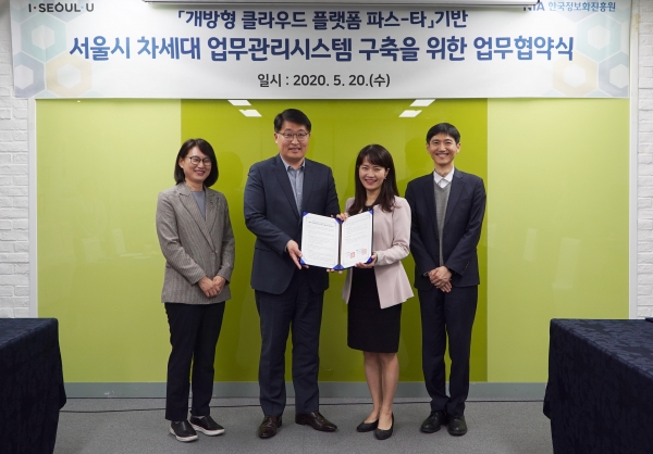 [디지털투데이 황치규 기자]한국정보화진흥원(원장 문용식, 이하 NIA)은 서울특별시(시장 박원순, 이하 서울시)와 5월 20일서울시청 본관에서 파스-타 기반 차세대 업무관리시스템 구축을 위한 상호협력 양해각서(MOU)를 체결했다고 21일 밝혔다.