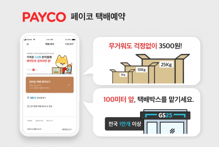 페이코 택배 예약은 택배 키오스크가 설치된 전국 GS25 편의점을 통해 택배 접수가 가능하고, 25kg 이하 물건은 3500원에 택배를 보낼 수 있다. 일정 무게 이하 시 값싼 요금제 적용은 쇼핑몰을 개설한지 오래 되지 않은 사업자나 택배사와 계약할 물량이 아닌 경우 또는 외부 활동이 잦아 픽업 기사를 기다리기 어려운 경우 등 개인과 소상공인들에 유리하다는 게 회사측 설명이다.