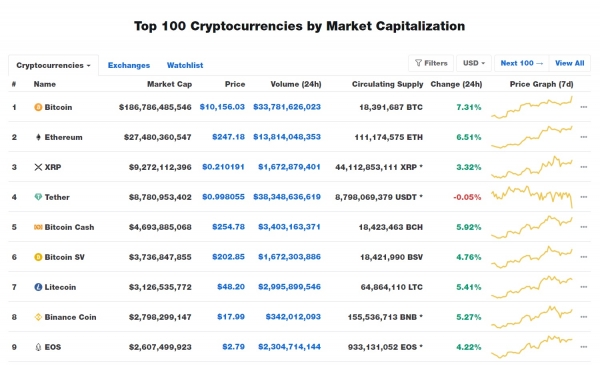 2일 가상자산(암호화폐) 정보 사이트 코인마켓캡에서 비트코인(BTC) 가격은 전날 대비 7.31% 오른 1만150달러(약 1242만원) 대에서 형성됐다.