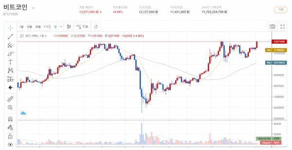국내 시장에서도 비트코인 가격이 상승했다. 가상자산 거래소 빗썸에서 비트코인 가격은 전날 대비 4.8% 가량 오른 1207만원을 기록하며 1200만원을 넘어섰다. 이더리움은 전날 대비 1.91% 오른 29만원, 리플은 1.13% 상승한 250원 선을 기록 중이다.