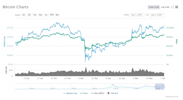 비트코인은 지난 2월 한때 1만200달러 선까지 올라갔다가 3월에 4900달러까지 크게 떨어지기도 했다. 이후 꾸준히 소폭으로 상승세를 보이다가 이날 1만 달러 대에 재진입한 모습이다.