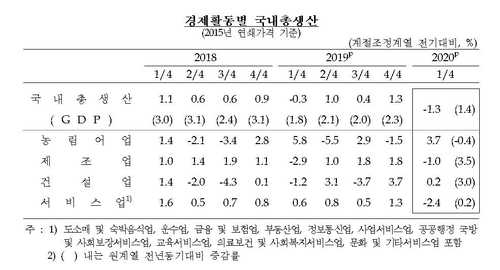 신종 코로나바이러스 감염증(코로나19) 사태 여파에 올해 1분기 성장률이 전분기 대비 -1.3%로 잠정 집계됐다. 지난 4월 발표된 속보치(-1.4%)보다는 0.1%포인트(p) 상향조정된 수치다.