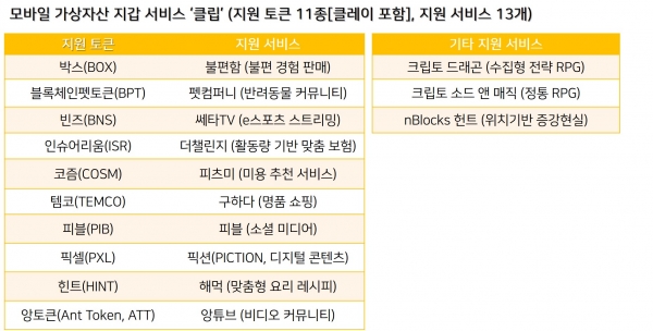 현재 지원하는 서비스는 13개다. 자체 토큰을 발행한 서비스 10개 외에 3개 비앱(blockchain app, 클레이튼 기반 블록체인 애플리케이션) 서비스를 지원한다. 클립에서 클레이튼 기반 서비스로 바로 들어갈 수는 없다. 지금은 해당 서비스 토큰을 보관하고 송수신할 수 있는 수준으로만 연동돼 있다.