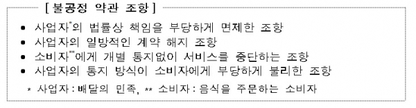공정위 지적에 따라 배민이 시정한 약관은 사업자의 법률상 책임을 부당하게 면제하는 조항, 사업자의 일방적인 계약해지 조항, 소비자에게 개별 통지하지 않고 서비스를 중단하는 조항, 통지 방식이 소비자에게 부당하게 불리한 조항 등 4개다.