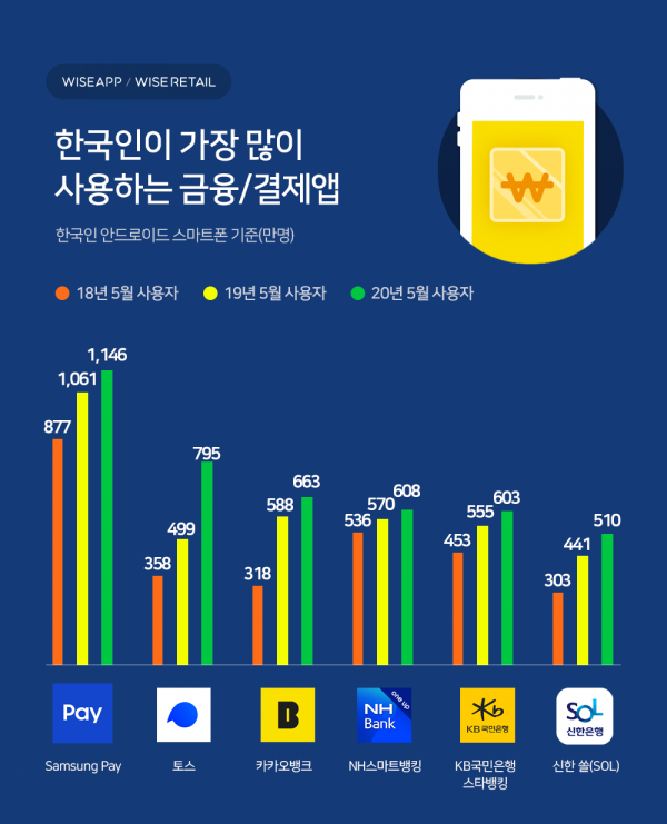 30일 앱/리테일 분석서비스 와이즈앱/와이즈리테일이 지난 5월 한국 안드로이드 스마트폰 사용자 금융결제앱 사용 현황을 조사해 발표한 내용에 따르면 전 세대를 합쳐 가장 많은 한국인이 이용한 금융 결제앱은 ‘삼성 페이’로 5월 한 달 1146만 명이 이용했다. 그 뒤를 토스 795만 명, 카카오뱅크 663만 명, NH스마트뱅킹 608만 명, KB국민은행 스타뱅킹 603만 명, 신한 쏠 510만 명 순이었다.
