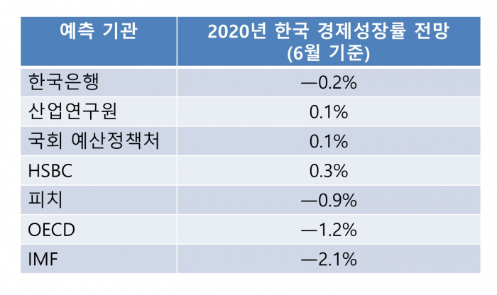 더 어려운 상황을 예견하는 곳들도 있다. 6월 24일 국제통화기금(IMF)은 세계 경제 전망 보고서 수정본을 발표하고 한국의 올해 성장률을 -2.1%로 전망했다. 다만 IMF가 발표한 올해 세계성장률을 -4.9%과 비교하면 한국의 상황은 상대적으로 나은 편에 속한다.