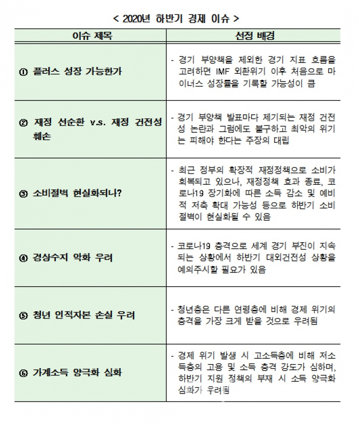 결국 코로나19에 얼마나 대응을 잘하는지 여부가 올해 하반기 한국 경제의 최대 이슈인 셈이다. 연구기관들은 코로나19가 한국에서 2차 확산될지를 중요한 요인으로 보고 있다. 플러스나 0% 성장을 예측하는 곳에서는 코로나19에 한국이 안정적으로 대응하는 상황을 가정하고 있다.