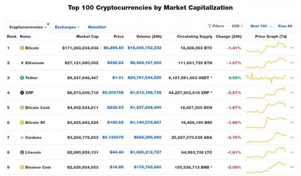 [디지털투데이 정유림 기자] 전날 9400달러 대를 회복했던 비트코인 가격이 9300달러 수준으로 다시 떨어졌다. 상위 10위권에 이름을 올린 가상자산(암호화폐)들도 대체로 하락세를 띠며 시장이 혼조세를 보이고 있다.
