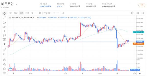 국내 시장에서도 비트코인 가격은 제자리걸음을 이어가고 있다. 가상자산 거래 사이트 빗썸에서 비트코인은 전날 대비 0.3% 하락한 1096만원 수준에서 가격이 형성됐다. 이더리움은 전날과 큰 변동이 없는 28만원, 리플은 0.25% 떨어진 240원 수준을 기록했다.