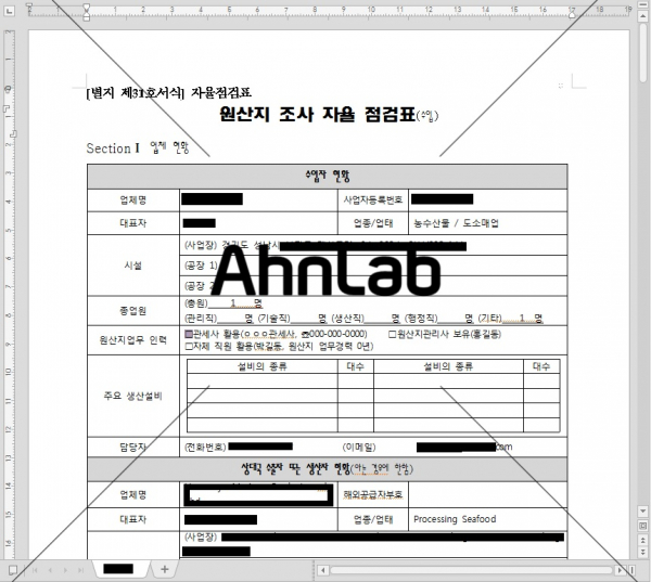 안랩에 따르면 먼저 공격자는 ‘별지 제31호서식’이라는 제목의 악성 한글 문서파일(hwp)을 유포했다. 해당 악성 문서 파일은 실제 법령에 있는 ‘원산지 조사 자율 점검표(수입)’ 서식 내용을 담고 있어 사용자가 악성 문서임을 인지하기 어렵다.