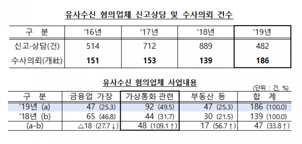 하지만 금감원이 유사수신 혐의로 지난해 수사당국에 수사의뢰한 업체는 총 186곳으로 2018년(139곳) 대비 33.8% 증가했다.
