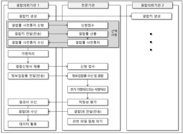결합 의뢰기관은 결합할 정보를 가명처리한 뒤 다른 의뢰기관과 협의한 방식으로 결합키를 만들어 데이터 전문기관에 결합 신청을 한다. 신청이 접수되면 전문기관은 해당 정보를 저장매체나 정보통신망을 통해 의뢰기관으로부터 전달 받아 결합한다. 전문기관은 적정성 평가에서 적정이 나올 때까지 의뢰기관이 요청한 '가명처리'나 '익명처리'를 작업을 한다. 평가가 끝나면 결합 정보는 의뢰기관에 전달된다. 전문기관은 수신 즉시 관련된 파일 전부를 파기해야 한다.