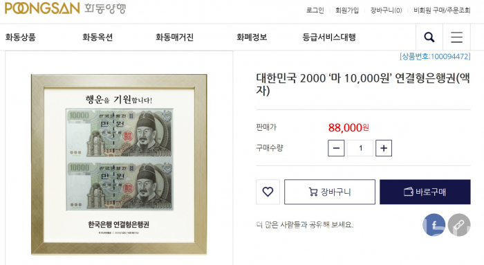 조폐공사 쇼핑몰에서 1만원 지폐 두장 연결권은 액면가보다 비싼 2만6800원에 판매되고 있다. 그럼에도 연결권이 판매된 올해 6월부터 문의와 구매가 꾸준히 이어지고 있다고 한다.
