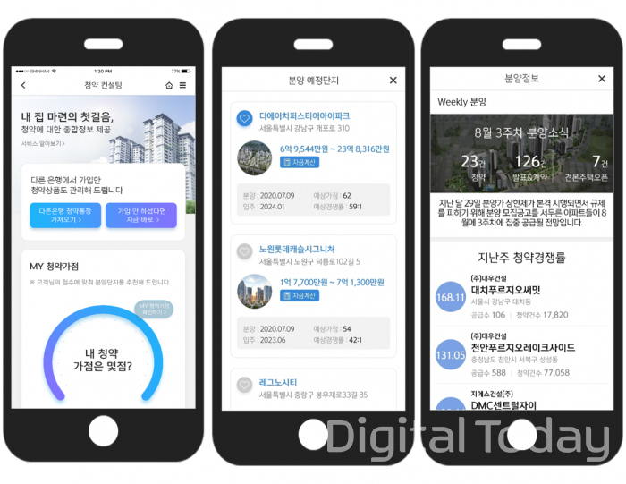 또 고객이 청약가점을 등록하면 청약점수에 따른 분양예정단지를 추천해 주고, 관심단지를 설정하면 입주자모집공고에 대한 알림서비스를 제공한다. 분양가 대비 예상대출한도와 고객의 자산현황을 반영해 필요한 대출금액도 알려준다.