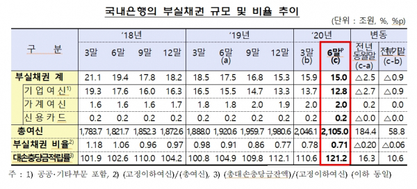 이와 관련해 한 금융권 관계자는 “생각했던 것만큼은 부실채권 증가폭이 크지 않았다. 추후에도 리스크 관리에 중점을 두고 있는 만큼 부실채권에 대해 예의주의할 것”이라면서도 “다만 금융지원으로 이자 상환 등이 유예되면서 부실채권이 숨어 있을 가능성이 있어 말하기 이른 감이 있다”고 지적했다.