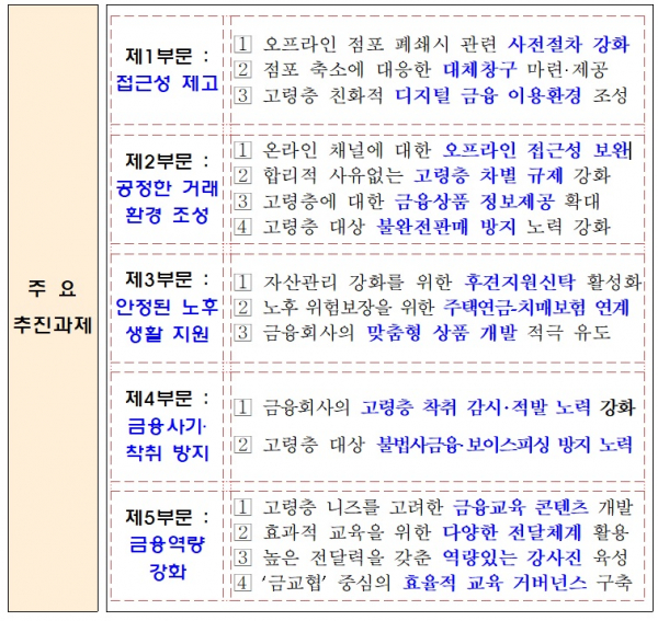 고령층의 온라인 거래 접근성도 높인다. 금융 기관이 고령자 전용 모바일 금융 앱을 개발해 공급하도록 정부가 큰 글씨, 쉬운 인터페이스 등 전용 앱 가이드라인을 만들어 배포한 뒤 운용 실적을 점검할 예정이다.
