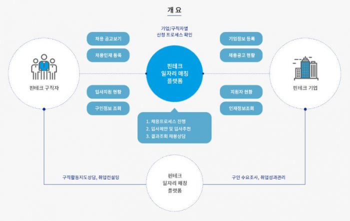 지난 7월 문을 연 '핀테크 포털' 내부에 마련된 핀테크 일자리매칭 플랫폼은 핀테크 기업과 구직자의 정보 등록을 장려해 일자를 주선하는 역할을 한다. 구직자는 이름과 생년월일, 근무가능 분야, 학력정보, 경력 등을 기재한다. 기업들은 채용정보에 모집 분야와 내용, 고용형태, 급여, 우대 사항을 정리해 게시할 수 있다.