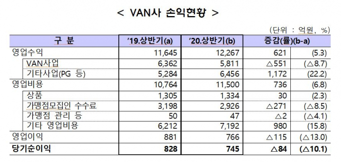 17일 금융감독원이 발표한 '2020년 상반기 밴사 영업실적(잠정)'에 따르면 시장점유율 97%를 차지하는 주요 밴사 13곳의 상반기 당기순이익은 지난해 동기보다 84억원 줄어든 745억원이었다.