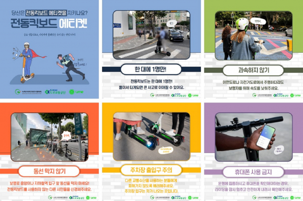 카드 뉴스는 전동킥보드 에티켓, 공유형 전동 킥보드 안전 수칙 지키기를 주제로 각각 2편이 제작됐다. 킥보드 에티켓 관련 내용으로는 한 대에 1명만 탑승, 보행자 동선을 막지 않도록 주차, 주행시 주차장 출입구 주의 등 보행자와 차량 운전자들에게 피해를 주지 않는 킥보드 사용법을 안내한다. 안전 수칙 지키기에는 킥보드 운행 관련 법규 이해, 탑승 전 기기 작동 여부 확인, 헬맷 착용 및 매너 있는 주차 등 안전한 공유 킥보드 사용을 위한 체크리스트를 담았다.