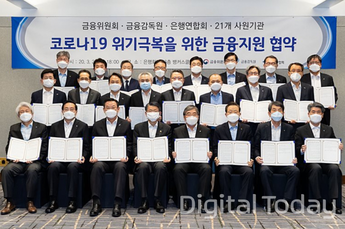은성수 금융위원장(앞줄 왼쪽 네 번째), 윤석헌 금융감독원장(다섯 번째)이 3월 23일 서울 중구 은행회관에서 시중 은행장들과 '코로나19 위기극복을 위한 금융지원 협약'을 체결했다. [사진: 금융위원회]