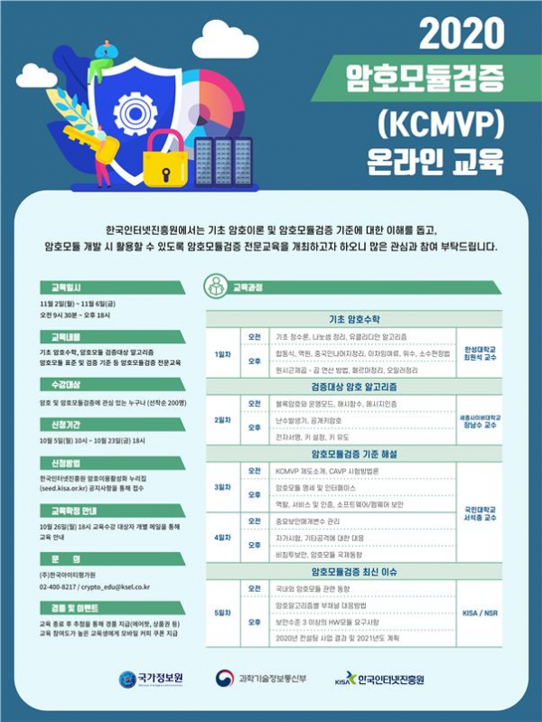 [디지털투데이 정유림 기자] 한국인터넷진흥원(KISA, 원장 김석환)은 국가정보원, 과학기술정보통신부와 함께 암호모듈검증(KCMVP) 시장 활성화 및 전문인력 양성을 위한 '2020 암호모듈검증 전문교육'을 오는 11월 2일부터 6일까지 5일간 온라인으로 실시한다고 4일 밝혔다.