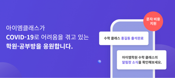 NHN에듀는 해당 캠페인을 통해, 학원 안심 운영 서비스 ‘아이엠클래스’ 문자 발송 비용을 지원한다. 지원 대상은 10월 이후 ‘아이엠클래스’에 신규 가입한 학원과 공부방이다. 학원 사업자 등록증 등 관련 서류를 제출하면 올해 12월까지 매달 최대 3만원의 문자 발송 비용을 지원받을 수 있다.