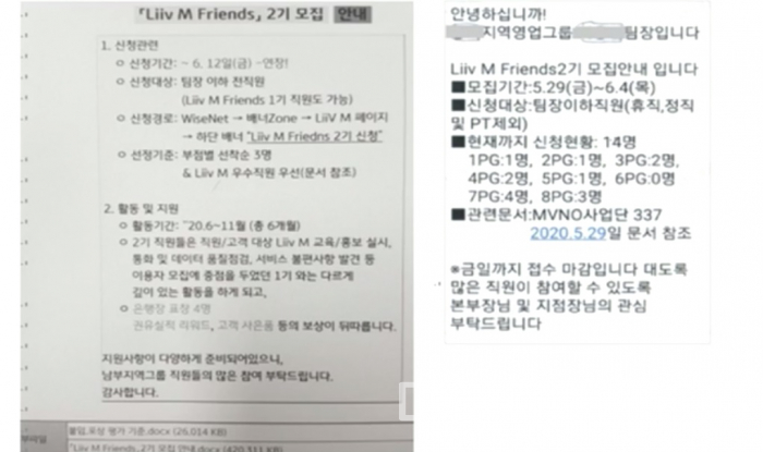 민 의원은 “KB국민은행의 리브엠 알뜰폰 사업이 그룹장 인사평가에 들어가 있다”며 “이런데 어떻게 실적 경쟁을 안하겠느냐”고 지적했다. 그는 “KB국민은행이 알뜰폰에 대해 영업점별로 실적을 조회할 수 있도록 해놨고 내부 문건을 보면 은행 직원 중 전담판매자를 등록하게 했다”며 “개인적 실적표로 만들어서 판매하도록 독려하고 있고 은행 내방 고객에 권유하라고 하고 있다”고 말했다.