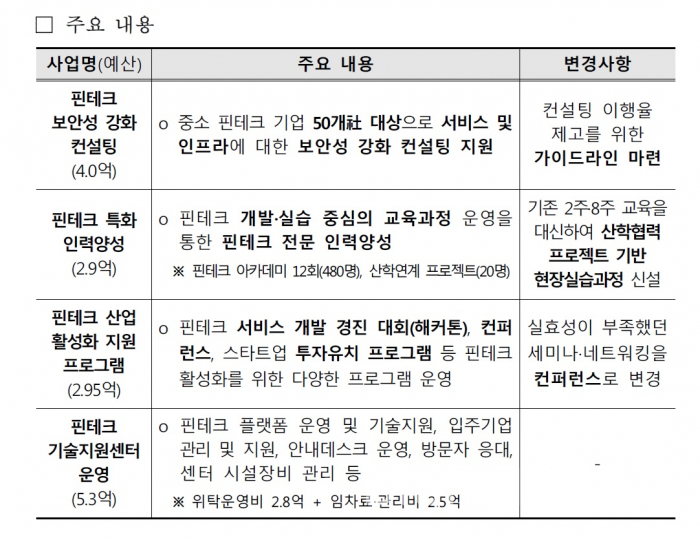 디지털투데이가 입수한 추진계획(안)에 따르면 KISA는 핀테크 서비스의 보편화로 보안에 대한 우려가 높아지고 있다는 점을 고려해 내년 중 50개 핀테크 기업들을 대상으로 맞춤형 보안성 강화 컨설팅과 보안 교육을 제공할 방침이다. KISA는 핀테크 솔루션의 보안성을 체크해 부족한 점을 지원하고 핀테크 서비스에 대한 보안 취약점 점검, 모의해킹도 지원한다.