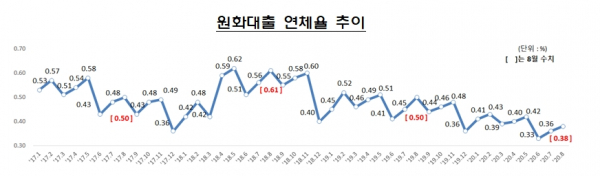 15일 금융감독원이 발표한 ‘2020년 8월 말 국내은행의 원화대출 연체율 현황’에 따르면 국내은행의 원화대출 연체율(1개월 이상 원리금 연체기준)은 0.38%로 전월 말(0.36%) 대비 0.02%p 올랐다.