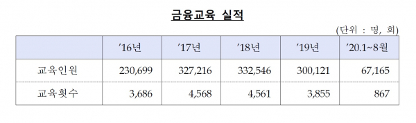 금감원에 따르면 2016년 3686회에 걸쳐 23만699명에게 금융교육이 이뤄졌다. 2017년에는 금융교육이 4578회 진행돼 32만7216명이 교육을 받았다. 이후 매년 30만명 이상이 금융교육을 받았다. 2018년에는 4561회 금융교육으로 33만2546명이, 2019년에는 3855회 금융교육으로 30만121명이 교육을 받았다.