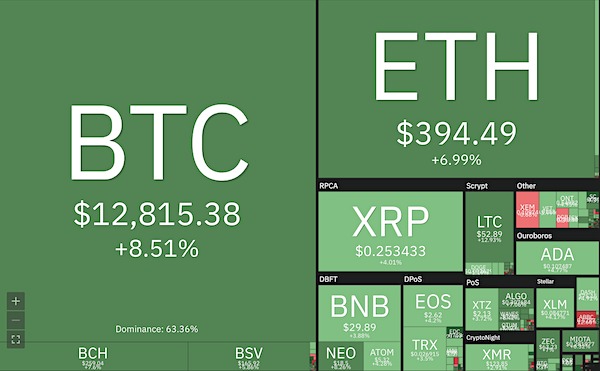 이더리움(ETH) 역시 전일대비 7% 가까이 급등한 394달러를 기록했다. 라이트코인(LTC)는 12.9% 폭등한 52.89달러, 리플(XRP)은 4% 상승한 25센트, 바이낸스코인(BNB)는 3.88% 오른 29.89달러, 비트코인캐시는 7.6% 상승한 259달러, 비트코인SV는 5.8% 상승한 165달러를 오르내리고 있다. 가상자산 톱10 종목 모두 적게는 4% 많게는 10% 이상 급등했다.
