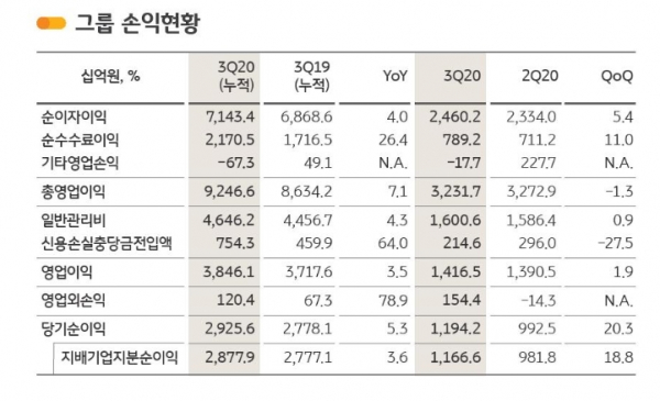 3분기 누적 당기순이익은 2조 8779억원으로 전년 동기 대비 3.6%(1008억원) 증가했다. 일회성 요인을 제외한 경상적 기준으로는 5.1%로 집계됐다.