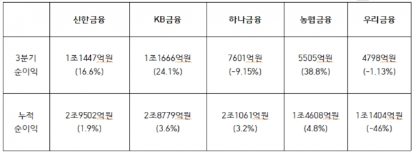 5대 금융지주 3분기 순이익 및 누적 순이익, 괄호는 전년 동기와 비교. [자료: 각 사]