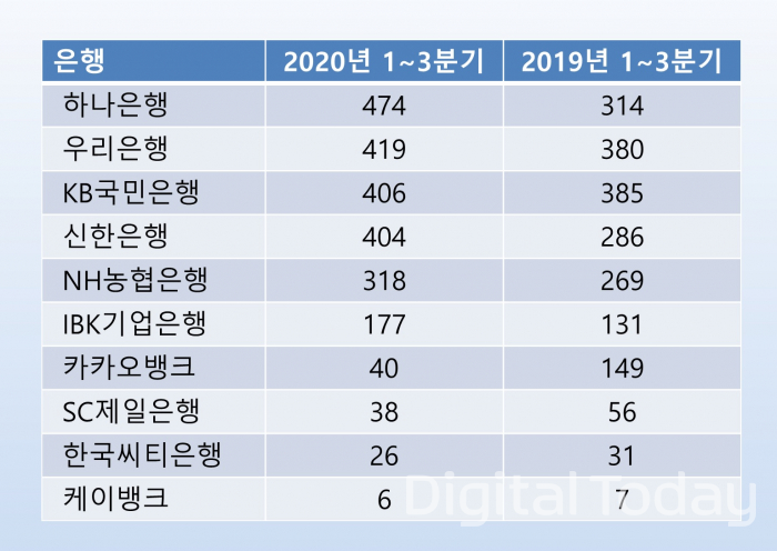 지난해 3분기까지 385건의 민원을 받아 민원 제기 1위였던 KB국민은행은 올해 같은 기간 406건으로 3위를 차지했다. 신한은행은 지난해와 올해 4위를 차지했지만 민원 자체는 지난해 3분기까지 286건에서 404건으로 41%나 증가했다. NH농협은행은 올해 3분기까지 318건의 민원을 받았고 IBK기업은행은 같은 기간 177건을 받았다.