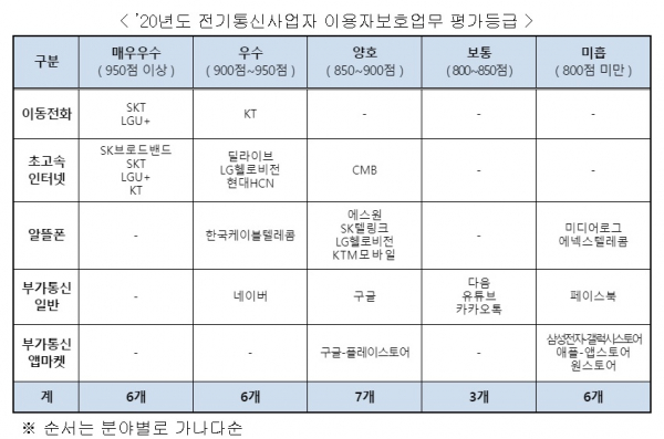 앱스토어(앱마켓), 페이스북(부가통신일반), 에넥스텔레콤(알뜰폰) 등 6개사의 경우엔 이용자 보호업무 관리체계, 피해예방 활동 실적, 이용자 의견 및 불만 처리실적 등 이용자 보호업무 수준이 전반적으로 미흡한 것으로 나와 업무 개선이 필요한 것으로 파악됐다.