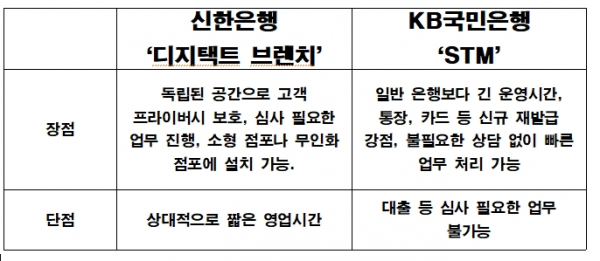업무 범위에서도 차이가 났다. 신한은행은 디지택트가 창구 영업을 그대로 가져왔다는 점을 강조하고 있다. 아직 시행 초기인 파일럿 단계인만큼 신규 가입과 대출 상담만 진행하고 있지만, 향후 고객 선호도에 따라 업무 범위를 늘려가겠다는 계획이다. KB국민은행의 STM는 은행판 ‘주민등록등본 무인발급기’ 같은 느낌이 강하다. 통장, 카드 재발급 등의 강점을 가지고 있지만 대출 등 심사가 필요한 업무를 지원하지 않는다.