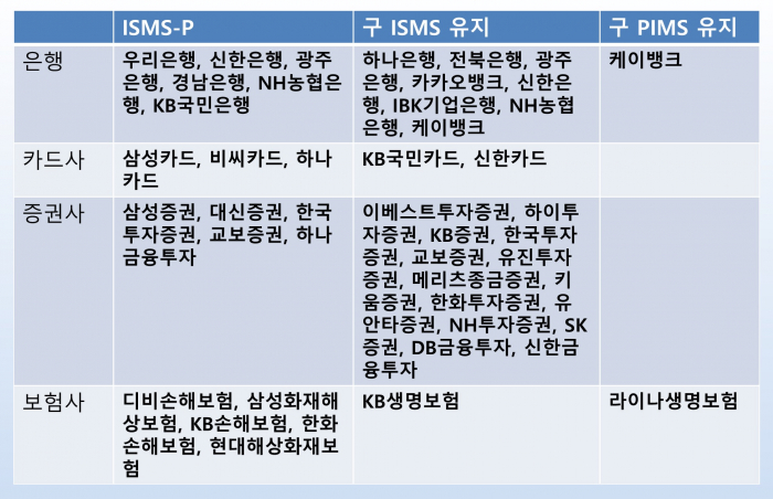 4일 금융권과 정보보호업계에 따르면 현재 11개 은행, 5개 카드사, 17개 증권사, 7개 보험사가 ISMS와 개인정보보호관라치계(PIMS) 인증을 획득, 유지하고 있다.