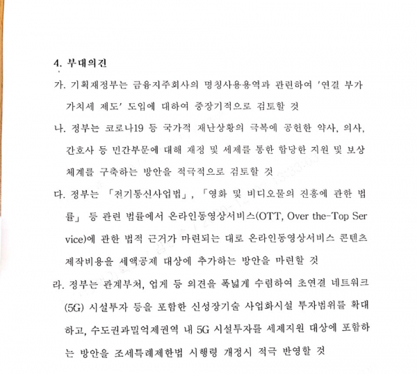 정부는 부대의견을 통해 OTT 콘텐츠에 대한 세액공제도 추진하기로 했다. 부대의견을 살펴보면 정부는 전기통신사업법, 영진법 등 관련 법률에서 OTT에 관한 법적 근거가 마련되는 대로 OTT 콘텐츠 제작비용을 세액공제 대상에 추가하는 방안을 마련하기로 했다. 초연결 네트워크(5G) 시설 투자 등을 포함한 신성장기술 사업화 시설 투자 범위를 확대하고, 수도권 과밀 억제권역 내 5G 시설 투자를 세제 지원 대상에 포함하는 방안도 추진하기로 했다.