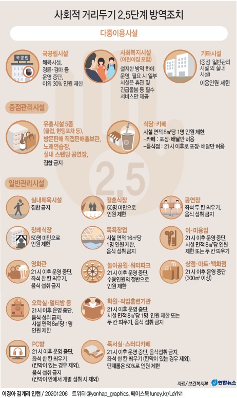 2.5단계가 되면 노래연습장, 실내체육시설의 운영이 중단되고 마트와 백화점, 영화관, PC방 등은 밤 9시 이후 문을 닫게 된다. 현행 거리두기 2단계에서는 중점관리시설(총 9종) 가운데 유흥주점, 단란주점, 감성주점, 콜라텍, 헌팅포차 등 유흥시설 5종의 영업만 금지되지만 2.5단계에서는 이에 더해 방문판매 등 직접판매 홍보관, 노래연습장, 실내 스탠딩 공연장에도 영업 금지를 뜻하는 집합금지 조처가 내려진다.