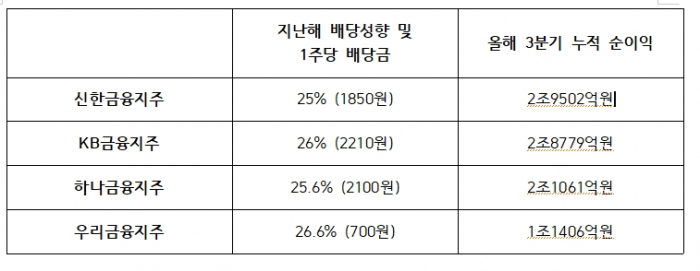 반면 금융지주사들은 난처하다는 입장이다. 지난해 금융지주사들의 배당성향은 KB금융 26%(2210원), 신한금융 25%(1850원), 하나금융 25.6%(2100원) 우리금융 26.6%(700원) 수준이다. 배당성향은 순이익 중 배당액이 차지하는 비율을 뜻한다.