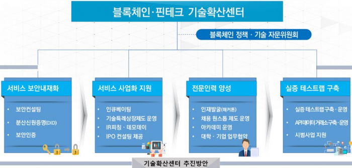 KISA 핀테크진흥팀 관계자는 "기존 운영해 온 핀테크 기술지원센터의 지원 범위를 블록체인 영역까지 확대하기로 했다"며 "기획재정부로부터 예산을 배정받아 이대로 사업을 추진하게 된다면 서울 가락동 소재의 센터 규모를 확충하고 센터명도 블록체인·핀테크 기술확산센터로 바꾸는 등 관련 작업을 할 방침"이라고 했다.