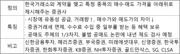 [디지털투데이 김현우 인턴기자] 시장조성자(Market Maker)는 한국거래소(KRX)와 계약을 맺은 증권사들이 특정 종목의 매수·매도 가격(호가)을 아래위로 제시해서 가격 변동성을 완화하기 위한 제도다. 시장에 자금(유동성)을 공급하고 개인투자자들의 원활한 거래를 돕는 역할을 한다.