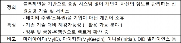 DID는 인터넷에서 신원정보를 증명하기 위해 공인인증서 등 개인정보를 기관의 중앙 서버에 저장하는 기존 방식에서 벗어나 스마트폰 등 개인의 기기에 신원정보를 분산시켜 관리한다. 이를 통해 외부 해킹으로 인한 개인정보 유출 가능성을 낮추고, 개인이 자신의 정보를 통제할 수 있다는 게 관련 업계의 설명이다. 또한 주민등록증, 여권 등 신원증명 정보를 비롯해 계좌번호, ID와 비밀번호 등 다양한 개인정보를 담을 수 있다는 점도 특징으로 꼽힌다.