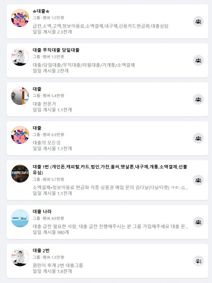 페이스북에 이런 대출 관련 그룹은 수십개에 달한다. 각 그룹은 수천명에서 수만명의 회원을 확보하고 있다. 단순히 검색에 노출된 10여개 페이스북 대출 그룹 가입자만 계산해도 7만명에 달했다.