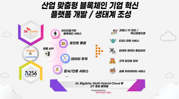 협력 일환으로 양사는 SK C&C 블록체인 플랫폼 ‘체인제트(Chain Z)’와 람다256 ‘루니버스’ 플랫폼 간 상호 기능 및 서비스 연계를 추진한다. 산업 수요를 반영한 서비스형 블록체인 BaaS(Blockchain as a Service) 공동 개발·운영은 물론 개별 기업 맞춤형 블록체인 시스템 개발도 상호 협력한다.