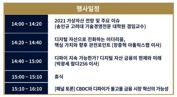 또 세계 각국 정부들이 관심을 보이고 있는 중앙은행 디지털 화폐 실험, 블록체인 기반 다양한 탈중앙화 금융(디파이, DeFi) 프로젝트들이 글로벌 금융 시장에 미칠 파장에 대해서도 논의할 예정이다.