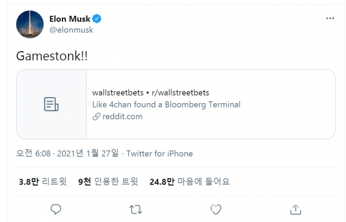 여기에 일론 머스크 태슬라 최고경영자(CEO)도 응원에 나섰다. 머스크 CEO는 26일 자신의 트위터에 '게임스통크(Gamestonk)’라는 글을 올리며 개인투자자들을 응원했다. 또 그는 28일 “집이 없으면 팔 수 없다. 차가 없어도 팔 수 없다. 주식은 없어도 팔 수 있다. 공매도는 사기다"라고 지적했다.