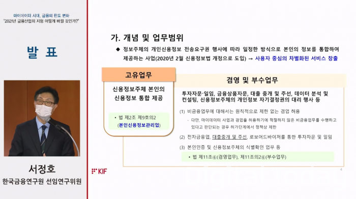 연구원은 지난해 6월과 7월 코로나19 위기 이후 금융산업의 디지털 대전환을 조명하는 행사를 연이어 개최했다. 또 7월 오픈뱅킹 도입성과와 발전방향 세미나를, 10월에는 디지털 금융 확산과 은행의 대응을 주제로 한 행사를 열었다. 10월 포스트 코로나 시대 비대면 은행 서비스와 관련된 행사를 마련했고 같은달 국제 핀테크 행사도 개최했다. 올해 금융연구원의 첫 행사도 마이데이터 시대 금융의 판도 변화에 관한 것이었다.