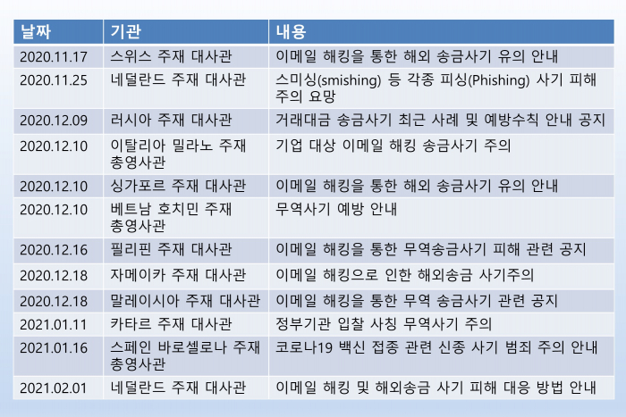 또 2월 1일에는 네덜란드 주재 한국대사관이 해킹을 경고했다. 대사관은 “최근 이메일 해킹을 통한 우리 국민 및 기업의 해외 송금사기가 지속되고 있다”며 “주로 우리 국민 및 기업들은 해외 무역 거래를 하던 중 해커들이 이메일로 계좌 변경을 요청한 것에 대해 확인 없이 송금하고 있어 많은 금전적 피해를 보고 있다”고 우려했다.