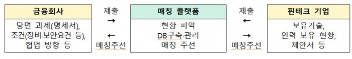 금융사와 핀테크기업 간 협업수요를 연결해 주는 '금융-핀테크 매칭플랫폼' 구축도 주된 과제로 꼽힌다. 금융사가 필요로 하는 기술과 핀테크 기업이 갖고 있는 서비스 등을 데이터로 구축해서 상호 제공하는 식이다. 매칭플랫폼은 양 진영 사이에서 현황을 파악하고 매칭을 주선하는 역할을 하게 된다.